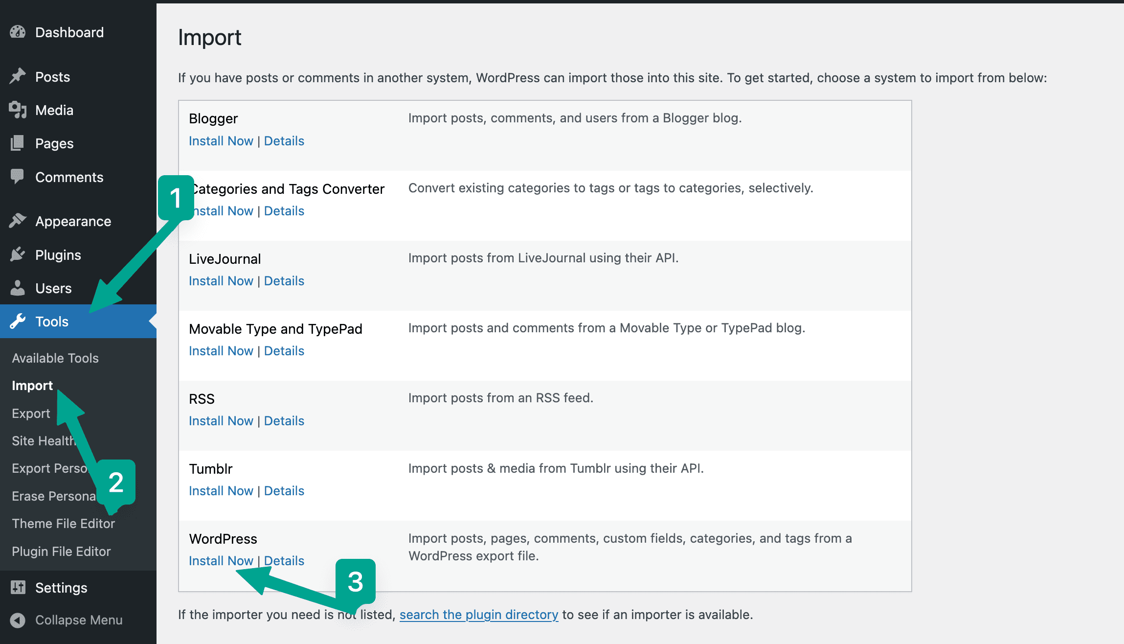 In the left sidebar of your WP admin, click on Tools > Import